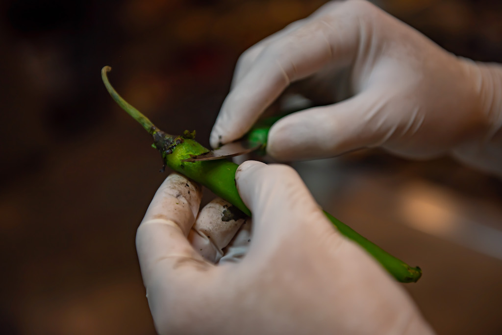 When it comes to prik yad sai (stuffed chili), most places use sweet pepper, but here Chef Thep opts for green goat horn pepper for a burnt, smoky touch. Inside goes lobster that’s been marinated with saam gler (coriander root, garlic and pepper). After steaming, the chilli is wrapped in a delicate egg net for an extra layer of texture.