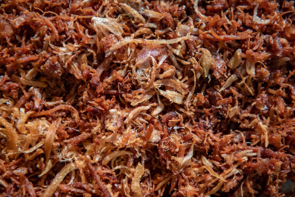 Organic Chai Aree chicken breast from Chonburi is steamed and shredded, seasoned with sugar and salt, and then deep-fried. An aromatic bite bursting with the fragrance of deep-fried shallot, black cardamom and long pepper.
