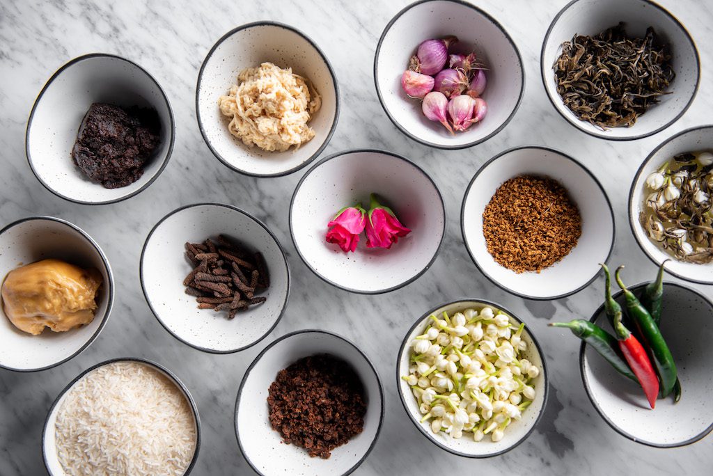 Khao chae, which means “rice soaked in water,” has a long, long history, which Chef Monthep “Thep” Kamolsilp seeks to explore in his own unique style. His sides are boldly flavoured and big on body-warming properties, which diners can enjoy with a refreshing blend of “scrubbed” jasmine rice, Korat osmanthus green tea and jasmine-infused water.